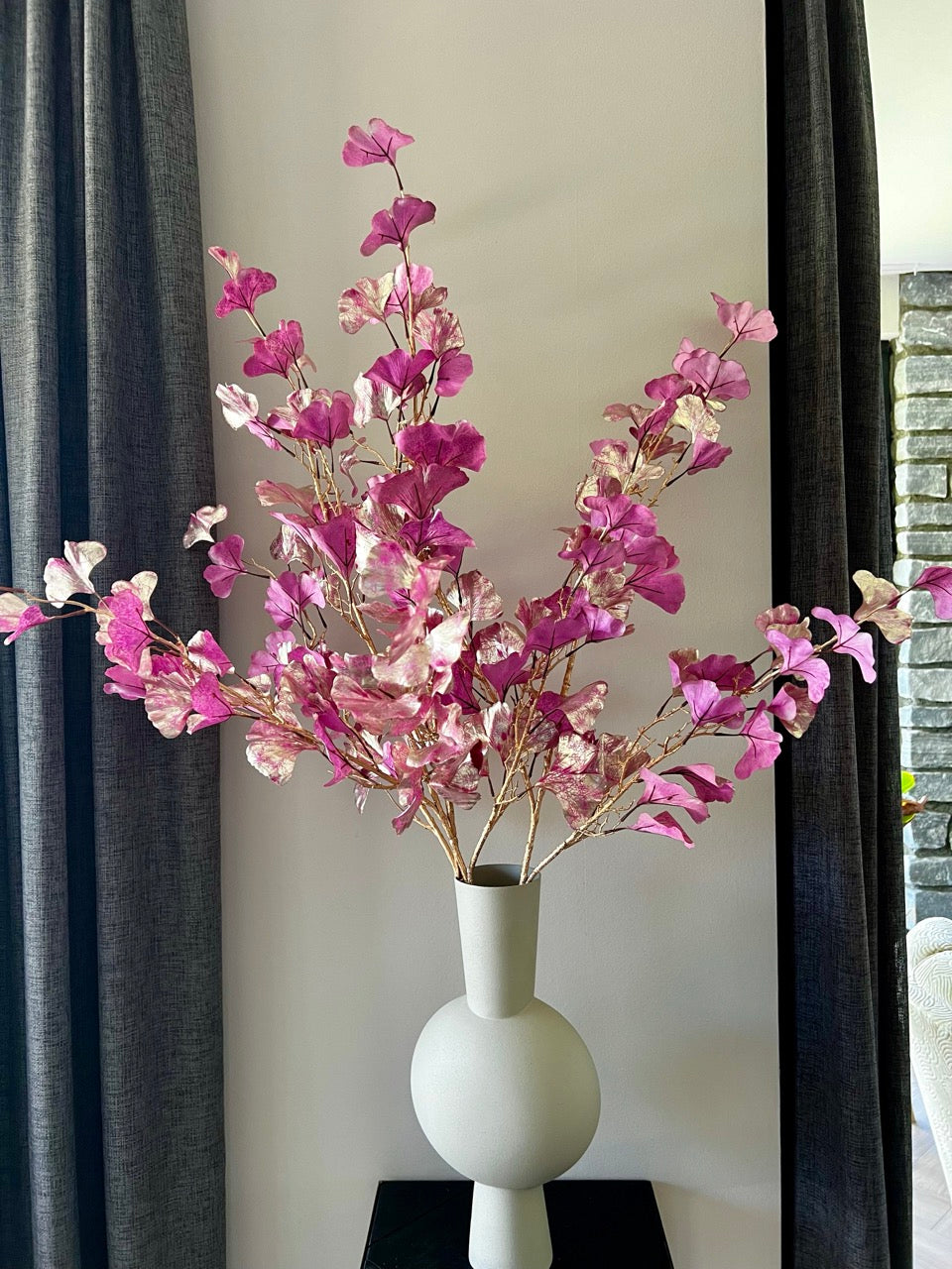 Voeg een vleugje luxe en verfijning toe aan je interieur met de Gingko Tak Ruka Roos in de kleuren goud en paars. Deze majestueuze kunsttak, met een indrukwekkende hoogte van 126 cm, is een perfect statementstuk voor elke ruimte.