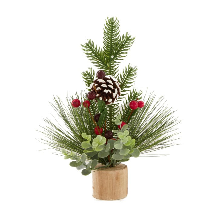 Leuke kerstdecoratie op een massief houten klosje. Deze decoratie is erg leuk om te combineren met andere items, zoals bijvoorbeeld kandelaars. Het is klosje is massief hout en hierop staan diverse dennentakken, besjes en een dennenappel.