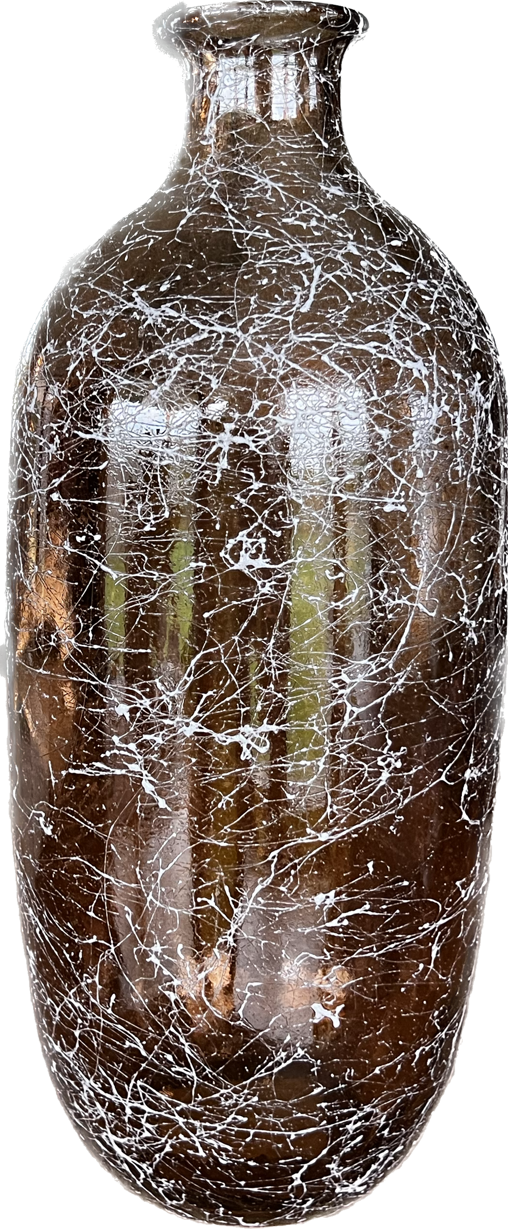 Deze unieke vaas heeft een erg gaaf wit patroon aan de buitenkant, waardoor het een soort spinnenweb lijkt. De vaas is echt uniek en kan het verschil maken in jou interieur. De vaas is gemaakt van duurzaam gerecycled glas. De vaas is erg leuk in combinatie met de Lagurus pluimen.