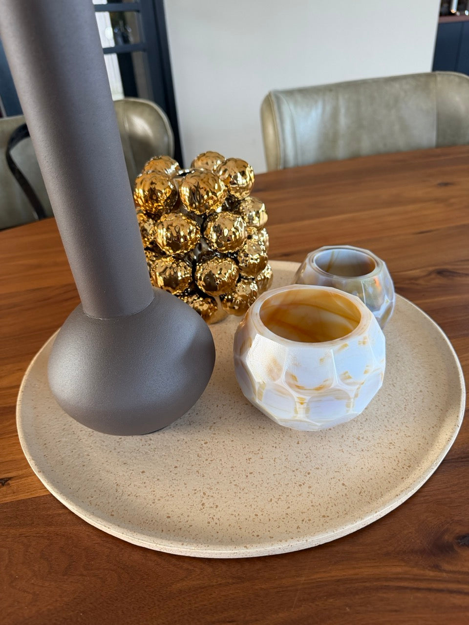 Gebruik de schaal als stylingbasis voor kaarsen, ornamenten of seizoensdecoratie, of laat haar juist leeg voor een minimalistisch statement. Door de lage rand blijft de look luchtig en strak.