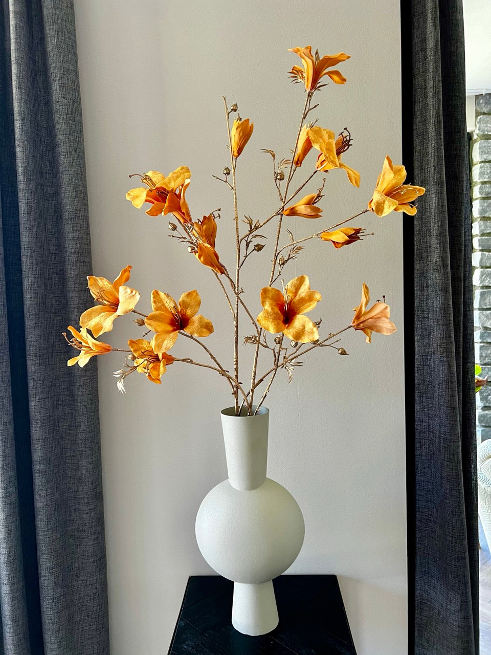Verleihen Sie Ihrem Interieur einen Hauch von Luxus und Wärme mit dem 114 cm hohen Bauhinia-Zweig in Orange/Gold . Ergänzen Sie Ihr Zuhause noch heute mit diesem atemberaubenden künstlichen Zweig und genießen Sie seine zeitlose Schönheit.