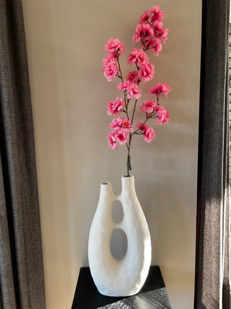 Holen Sie sich die bezaubernde Schönheit des japanischen Frühlings mit diesem großen Zweig der Japanischen Kirsche (Prunus Malaga) in Ihr Zuhause. Mit einer Höhe von 99 cm und wunderschönen hellrosa Blüten ist dieser Seidenblumenzweig eine stilvolle und elegante Ergänzung für jedes Interieur.
