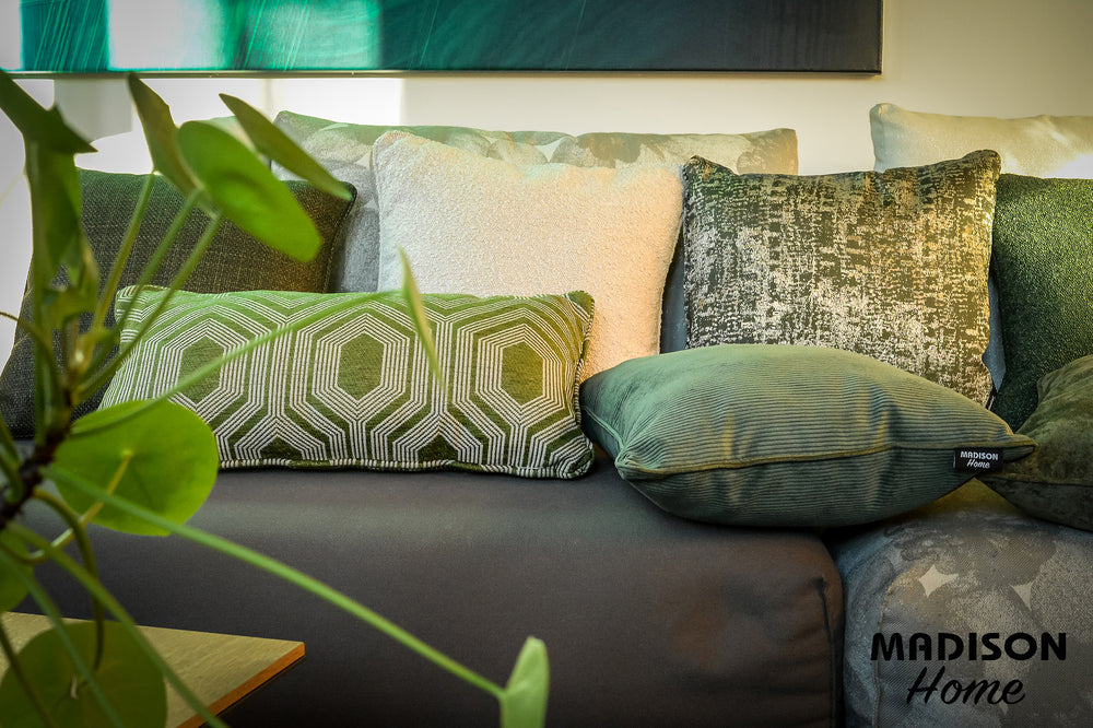 Ein sehr schönes dunkelgrünes Dekokissen mit geripptem Stoff. Dieses schöne Kissen aus der Madison Home-Kollektion ist eine schöne Ergänzung für Ihr Sofa.