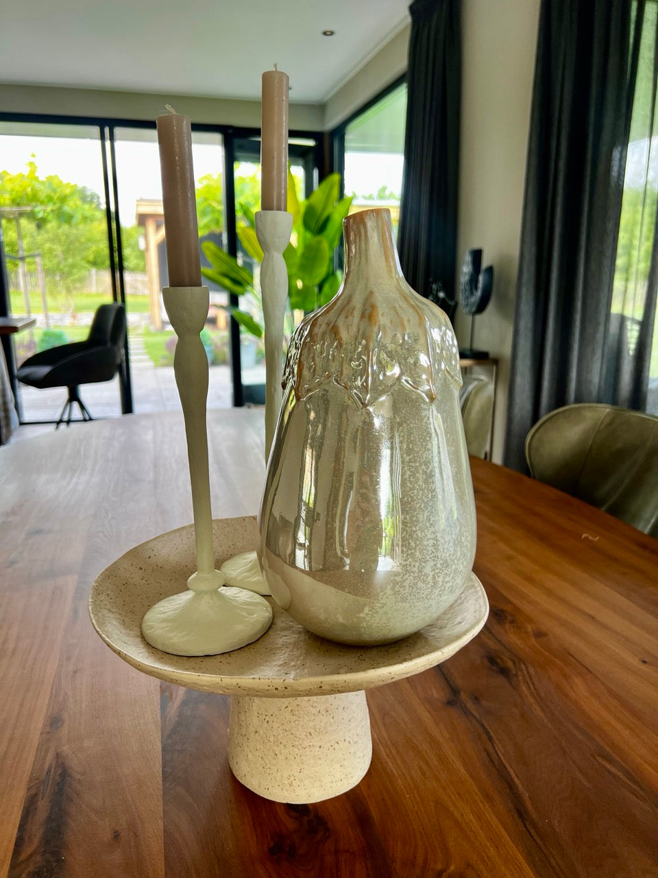 Een unieke vaas met parelmoer glans, organische vorm en elegante afwerking. Combineert prachtig met de schaal en kandelaars.
