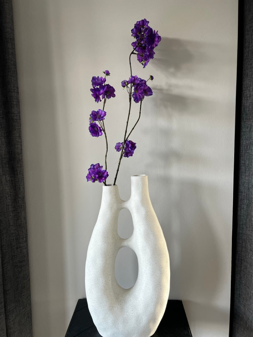 Verleihen Sie Ihrem Interieur einen Hauch von Eleganz und Farbe mit dem Silk-ka-Zweig Japanische Kirschblüte in einem wunderschönen Lilaton . Mit einer Höhe von 84 cm ist dieser luxuriöse Seidenblumenzweig die ideale Wahl für einen eleganten und natürlichen Look. Die zarten lila Blüten, kombiniert mit realistischen Details wie grünen Blättern, bringen die bezaubernde Atmosphäre des japanischen Frühlings direkt in Ihr Zuhause.