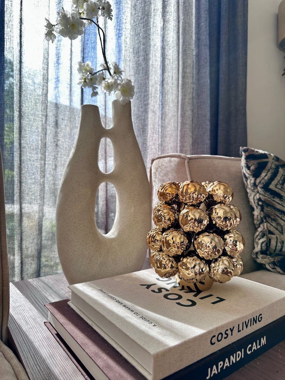 De gouden kleur en bijzondere vorm maken de Vaas BUTANG perfect om solo neer te zetten of te combineren met andere decoratieve items. Dankzij het compacte formaat past dit vaasje moeiteloos op een bijzettafel, vensterbank, dressoir of in een open kast.