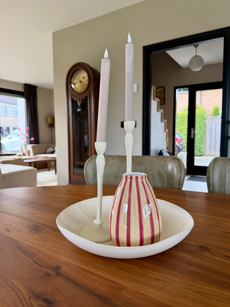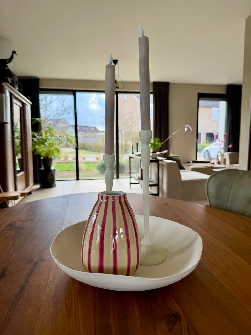De combinatie van de minimalistische schaal, de elegante ASOLO kandelaars en de speelse gestreepte vaas zorgt voor balans in vorm, hoogte en kleur. Met deze set creëer je in één keer een stijlvolle compositie die direct sfeer toevoegt aan je interieur.