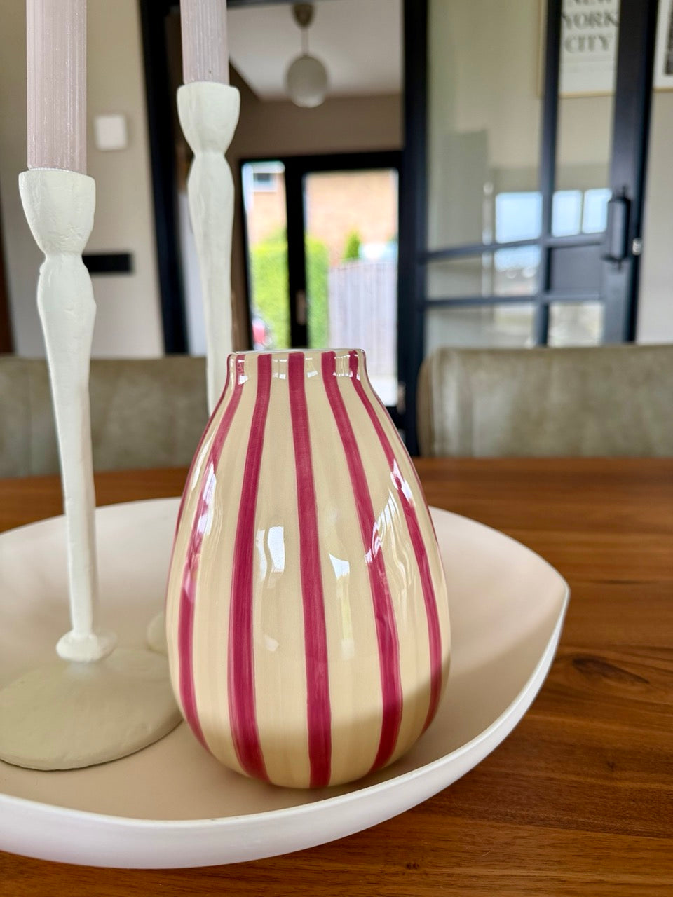 Het speelse middelpunt van de set is de keramieken vaas met roze strepen, die zorgt voor een subtiel kleuraccent en een frisse uitstraling. De combinatie van zachte tinten en verschillende vormen geeft deze set een moderne maar tijdloze uitstraling.